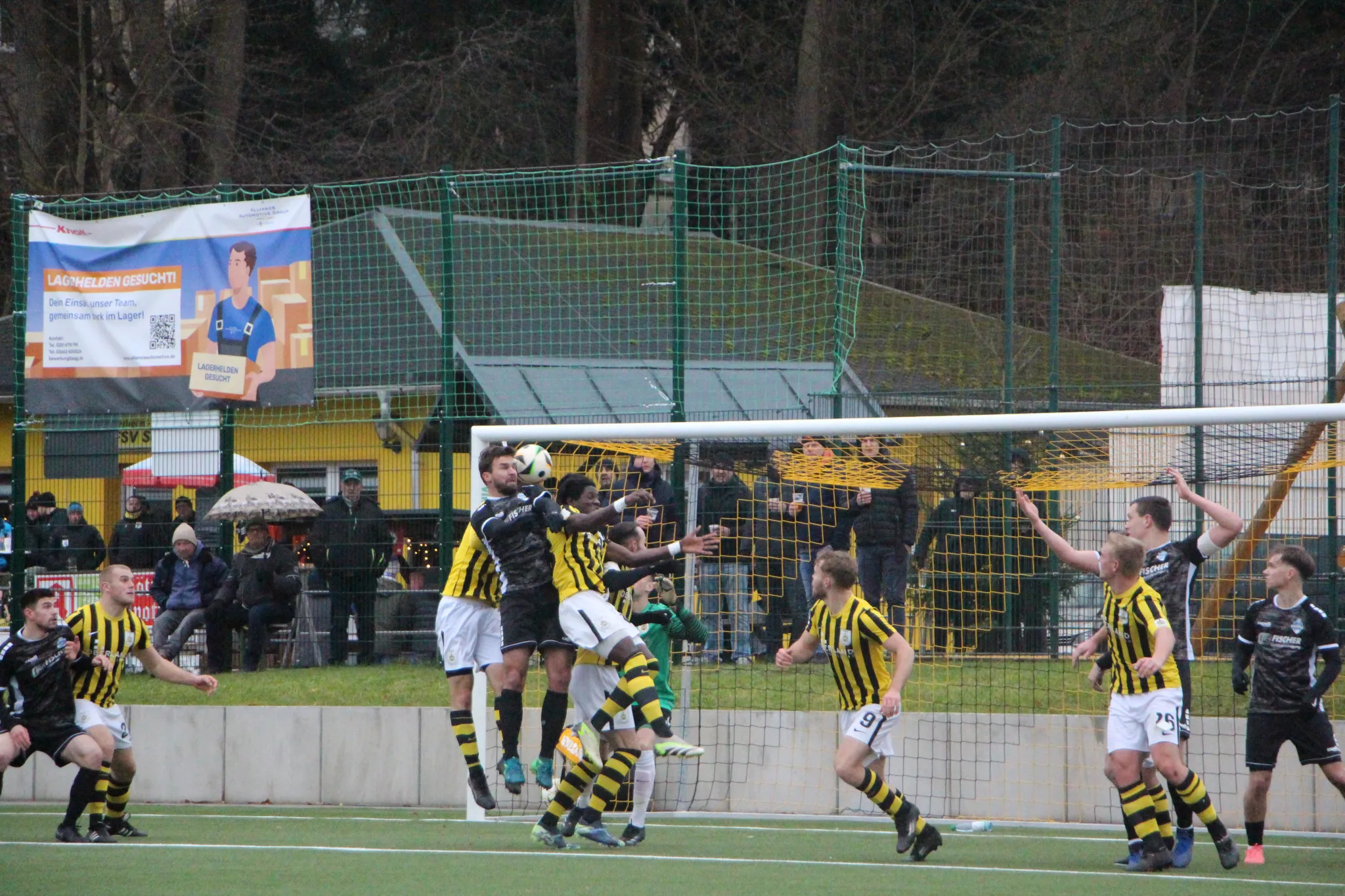 Und dann fiel er – der Anschlusstreffer, der niemals hätte fallen dürfen (wenngleich er angesichts der Anzahl an Chancen nicht unverdient war). Denn Nils Pichinot schaffte es diesen Einwurf fünf Meter vor dem Tor gegen drei Verteidiger und Hüter Groh im Luftduell einzuköpfen (s. Bild) und erzielte so das 2:1 ([45+7].). Dann war Pause.