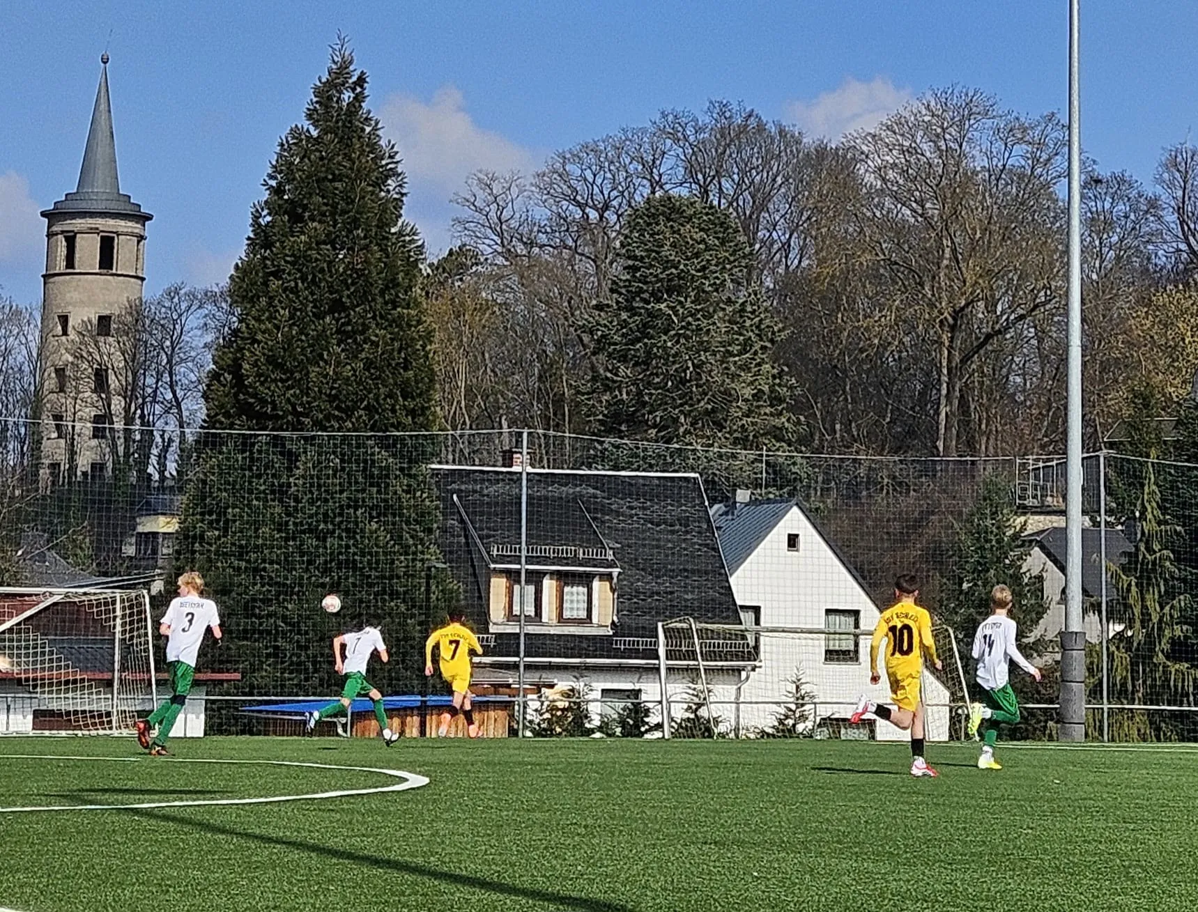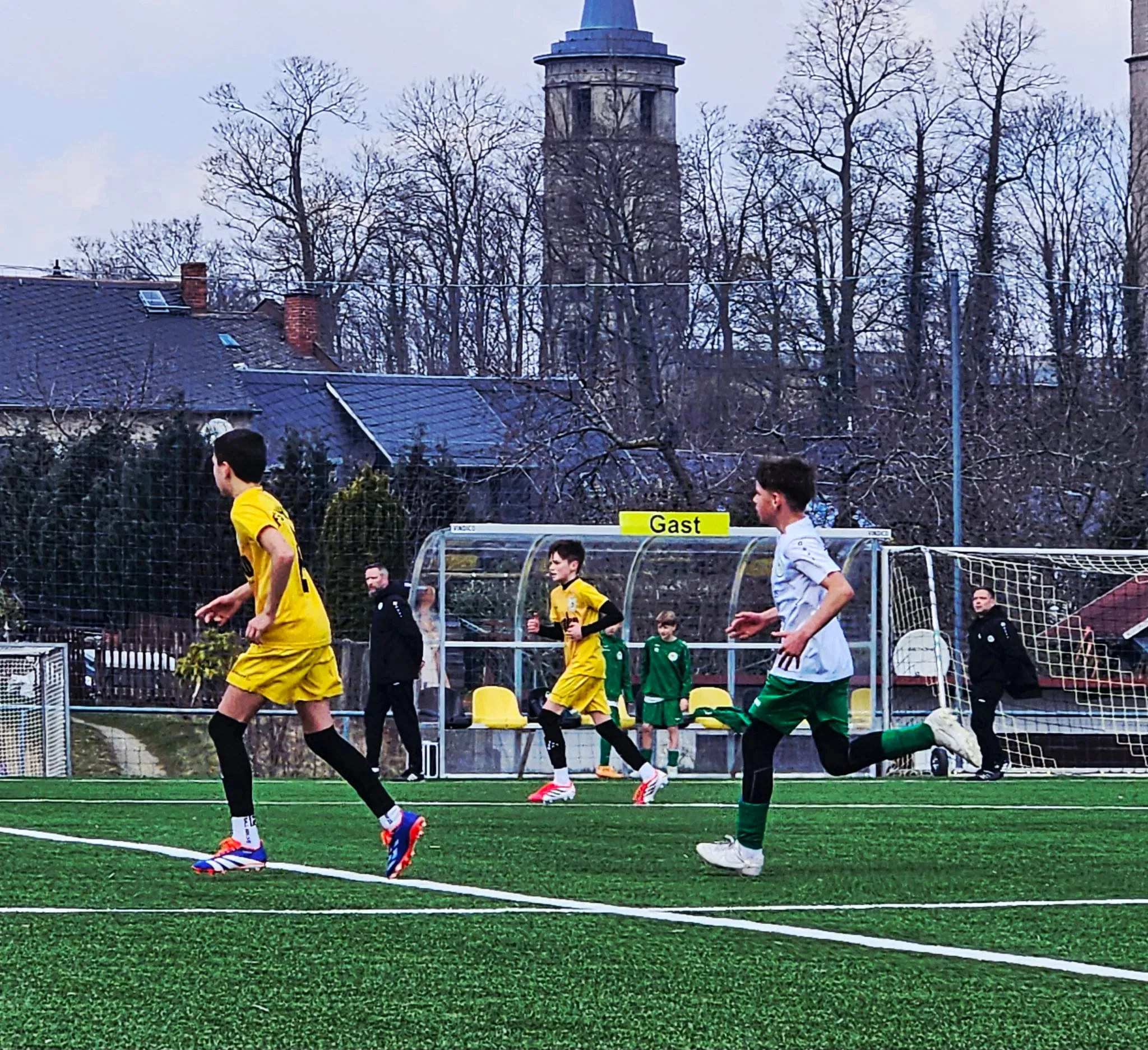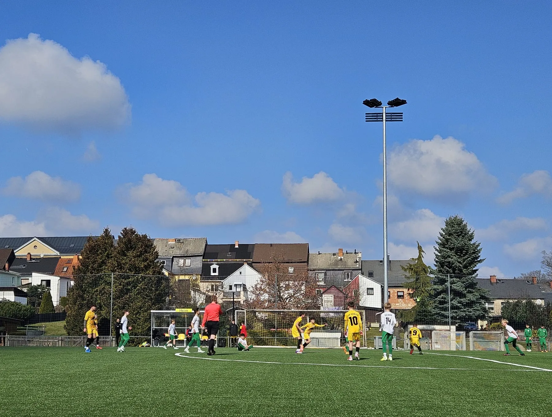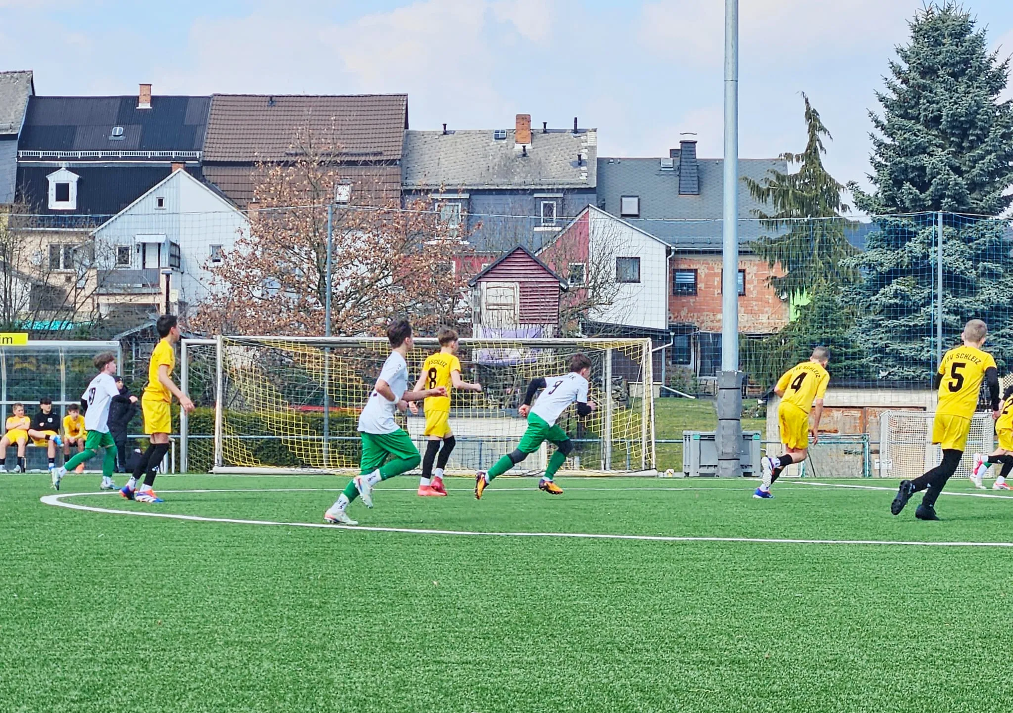 Julian - heute sehr spielfreudig und handlungsschnell - entschied häufig geschickt „1 vs. 1 Situationen“ zu seinen Gunsten und stellte so die vielbeinige Abwehr der Weimarer immer wieder vor große Herausforderungen. Ihm gelang auch der völlig verdiente Anschlusstreffer. Seine Einzelaktion erzwang kurze Zeit später auch den Führungstreffer der Schleizer - ein Eigentor durch einen Verteidiger aus Weimar. So ging es in die Halbzeitpause. Erik und Frank machten ihren Jungs in der Ansprache klar, die Spannung für die zweite Halbzeit hochzuhalten. Doch der Appell, einen Treffer nachzulegen, verpuffte.