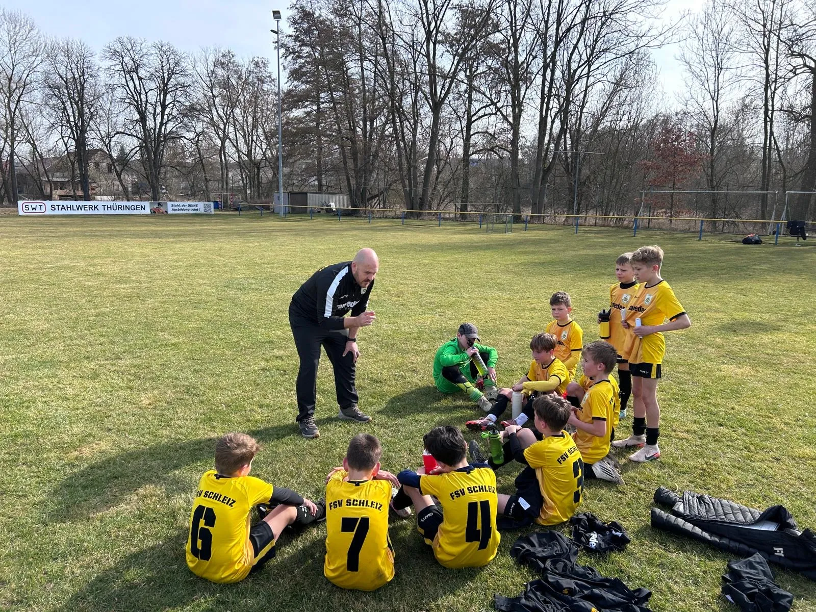 Der FSV versuchte von Anfang an die Kontrolle zu übernehmen, allerdings gelang das meist nur bis zum Strafraum; im Abschluss blieben die Schwarz-Gelben zu harmlos. Vielleicht doch noch etwas schläfrig, fehlte in Halbzeit eins die Durchschlagskraft und der unbedingte Wille zu gewinnen. Auf die Frage von Matthias, die über den ganzen Platz hallte „Hast du gestern Abend zu lang Fernsehen geguckt?“ traute sich kein Schleizer zu antworten….Paul, Til, Lenny, Otto, Lian und Friedrich hatten zwar Chancen, aber wirklich zwingend war das nicht. Nach Lenny’s Ecke hatte Paul die beste FSV-Chance, jagte den Ball aber übers Tor. Die JFC-Jungs konzentrierten sich aufs Konterspiel und verteidigten äußerst geschickt. Die Schleizer bissen sich an den ballsicheren und körperlich starken Orlatalern immer wieder die Zähne aus. Wie so oft im Fußball: wenn du vorne nicht triffst, wird‘s hinten ungemütlich. Viel Glück hatten die Schleizer als ein strammer Schuss des JFC hauchdünn an Logan‘s Kasten vorbeischrammte. Mit dem tiefen Boden taten sich die Schleizer schwer und konnten ihr Passspiel nicht wie gewohnt aufziehen, so dass es mit dem torlosen Unentschieden in die Pause ging. Ein besonderer Höhepunkt in der Halbzeit war die Auslosung des Pokal-Viertelfinales durch den Staffelleiter, die alle Kicker und Zuschauer gebannt verfolgten. Auf unsere Schleizer wartet womöglich in 2 Wochen erneut der JFC im Pokalspiel - vorausgesetzt sie gewinnen ihr Achtelfinale noch gegen die Tannaer.