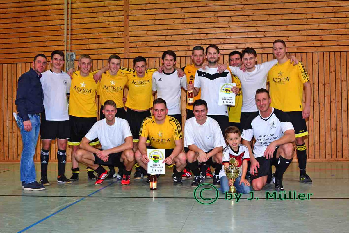 Eintracht Goldberger als Turniersieger in weiß spielend vereint mit der zweitplatzierten Mannschaft Acerta Maklerunion.