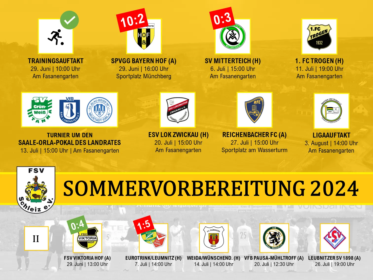 Unsere Verbandsliga-Mannschaft arbeitet weiter fleißig an der Grundlage für eine erfolgreiche Saison und bestreitet am heutigen Donnerstag, dem 11. Juli, ihr drittes Testspiel der Sommervorbereitung 2024. Gegner wird der 1. FC Trogen sein.